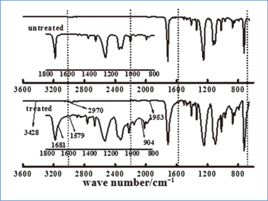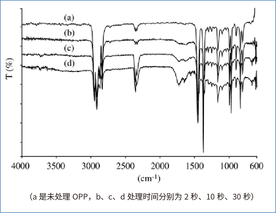 有研究人员[1],[2]通过对电晕处理过的表面进行光谱分析对比,如图2、图3所示,发现处理过的表面有大量的负极氧离子(羟基、羧基、羰基含氧基团)产生。