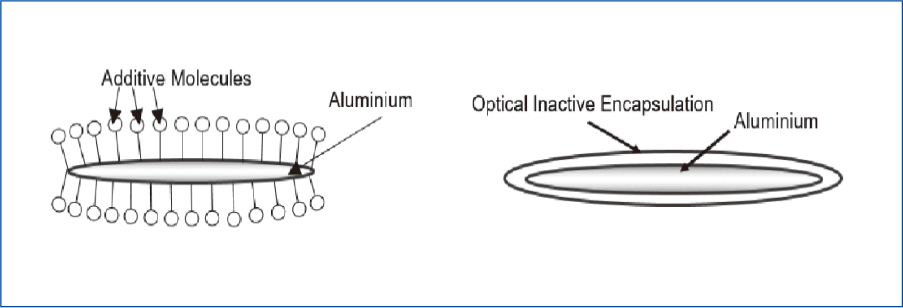 《卫星式柔印》工具书中的油墨章节中,系统地介绍了金属颜料的化学改性机理,出于应用的要求,它的侧重点是钝化处理,也就是通过各种化学反应或者吸附涂层让材料惰性化。如图9所示,包括了助剂改性和硅改性。
