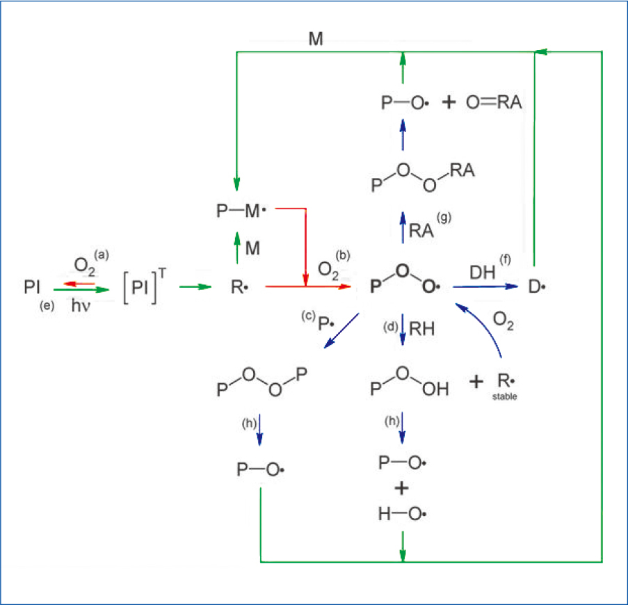 以平顶网点为特点的版材(制版)技术的广泛应用,是近些年柔印质量大幅提升的关键之一。它的关键在于克服了一个自由基聚合机理中常见的氧阻聚现象(即氧气的存在淬灭了自由基聚合中关键的引发剂,导致聚合效率下降,如图12所示)。