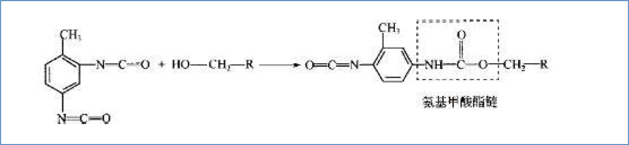 印刷结束,并不意味着化学变化的终止。一些食品包装需要上胶复合,它通常是基于异氰酸酯与多元醇(羟基)的固化反应(反应式见图5)。