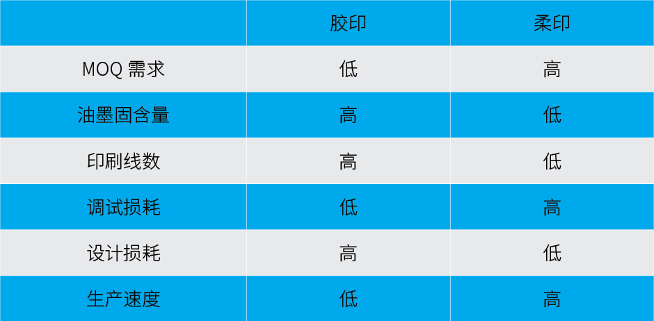 通过表1所示的胶印和柔印对比分析,我们不难发现,胶印的优势在于印刷图案相较于柔印更加精美、调试损耗更低、对最小起订量(Minimum order quantity, MOQ)需求量更小,当然柔印的优势也很明显,如:设计损耗低、生产速度更快。