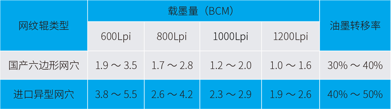 只提高网纹辊线数,会带来上墨量和色密度降低的问题。那么就需要选择高线数、大载墨量、高油墨转移率的网纹辊,通过表2国产六边形网穴与进口异型网穴网纹辊数据对比可以发现,传统六边形网穴网纹辊不利于高线数、大载墨量、高油墨转移率的实现;特别是为了提高油墨转移率,应该对各种网穴的网纹辊进行详细的对比测试,选择适合自身印刷机和油墨的网纹辊配置。