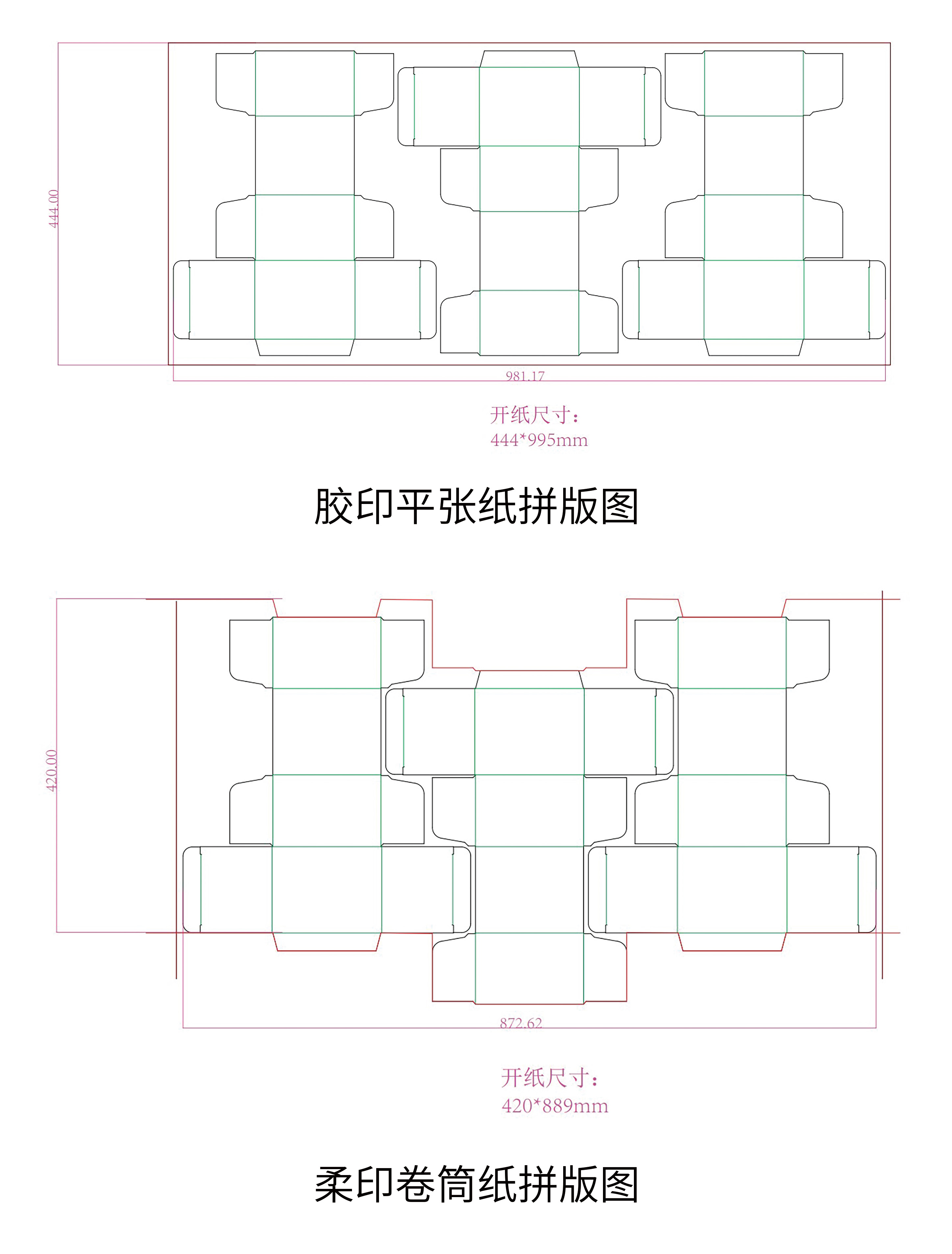 我们进行过详细计算,相同尺寸的产品,分别按照胶印(平张纸)和柔印(卷筒纸)的方式进行拼版,柔印可以节约10%以上的原材料。
