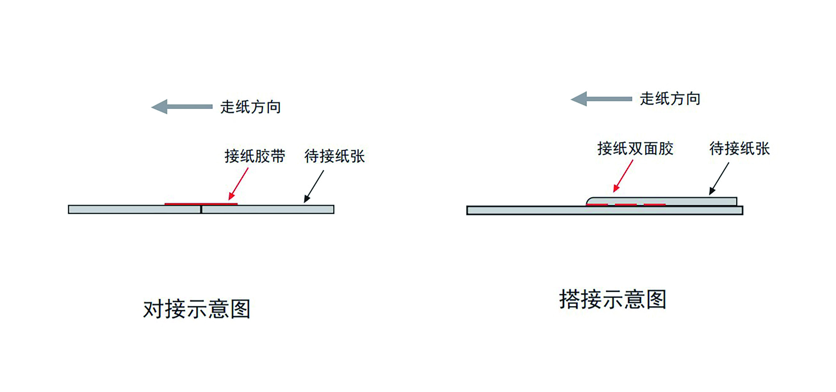 胶转柔的柔印机应配置不停机换卷装置。薄纸印刷可以选择搭接(如图7右图所示)的方式进行不停机换卷,而厚纸印刷需要选择对接(如图7左图所示)的不停机换卷方式,因为对接可以在过接头时不离压印刷,将换卷损耗控制在几米内。